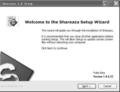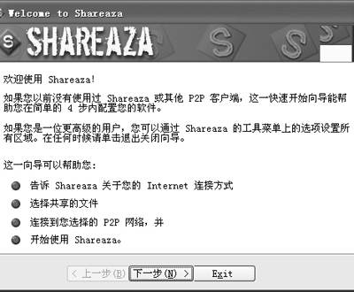 初次使用时,Shareaza会通过一个向导帮助用户配置程序,如图27所示,点击“下一步”按钮,我们可以设置Internet连接方式、选择共享文件或文件夹、设置P2P方式等,默认的共享文件夹是“\Shareaza\Downloads”,当然你也可以添加新的共享文件夹。