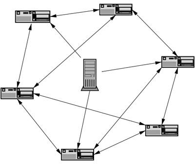 就HTTP、FTP、PUB等下载方式而言,一般都是首先将文件放到服务器上,然后再由服务器传送到每位用户的机器上,它的工作原理如图1所示。因此如果同一时刻下载的用户数量太多,势必影响到所有用户的下载速度,如果某些用户使用了多线程下载,那对带宽的影响就更严重了,因此几乎所有的下载服务器都有用户数量和最高下载速度等方面的限制。