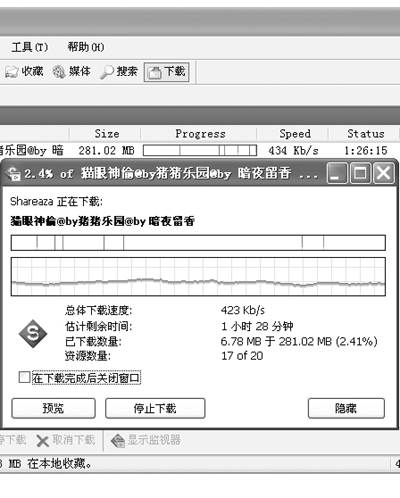 接下来,Shareaza会自动开始下载文件,如图30所示,一开始的下载速度可能不会太快,但随着时间的推移,下载速度会越来越快,当然也有可能会越来越慢。不过,这里要说明的是图中显示的“423Kb/s”实际上代表的是“54.6KB/s”,朋友们可不要太激动呀。