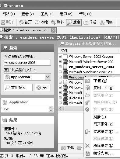 除了从BT服务器下载文件外,我们还可以利用Shareaza从Magnet、Piolet、Gnutella、eDonkey2000服务器下载自己所需要的文件,不过你首先必须从“网络→选择网络”中登录到相应的服务器,待连接成功后,接下来就可以根据适当的关键词进行搜索,如图31所示,找到自己所需要的文件后,从右键菜单中选择“下载”命令就可以开始下载了。