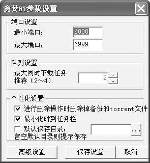 在默认设置下,贪婪BT最多可以同时下载两个任务,如果你嫌少的话,可以打开图11所示的参数设置窗口重新调整,但笔者建议还是不要太贪心。如果使用的是Windows XP,则可以选择4~6个任务;如果使用的是Windows 2000,可以选择3~4个;如果使用的是Windows 9X/Me,那么请使用缺省设置值,当然如果你的电脑配置比较高,同时运行的任务数也可以适当增大一些。