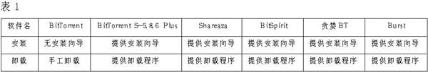 在这6款BT软件中,BitTorrent安装时完全在后台进行,仅仅在安装结束时弹出一个对话框告诉用户已经安装结束,安装后也不会在“开始”菜单和桌面上生成快捷方式或图标,当然在双击下载回来的torrent文件时,系统会自动调用程序。令人苦恼的是,在卸载BitTorrent时,同样必须手工执行C:\Program Files\BitTorrent\Uninstall.exe文件,而且还必须手工删除安装文件夹才行。6款BT软件的安装及卸载情况见表1。