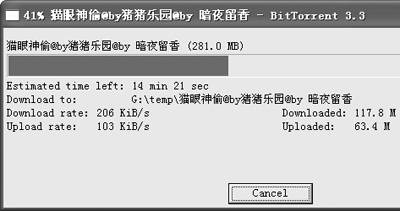 提示:即使由于某种原因你已经关闭了BT下载窗口,也没有什么关系,只要再次双击*.torrent文件,BitTorrent会重新扫描本机中已下载的文件并提供上传服务。不过,非常可惜的是,在BitTorrent的下载窗口中,我们并不能查看到关于BT服务器地址、认证码、块数、种子数等非常重要的数据,而且你几乎不能进行任务操作(除了点击“Cancel”按钮放弃下载外),不能不说是一种遗憾。