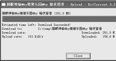 文件下载结束时,会弹出图7所示的对话框,提醒你“Download Succeeded!”,建议暂时不要关闭这个对话框,这样就可以继续向其他用户提供下载种子,正如他们向你提供下载种子一样,这才是网络共享的精髓所在。