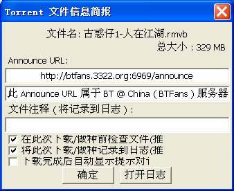 双击桌面上的BitTorrent S-5.8.6 Plus图标,程序首先会弹出图13所示对话框,要求选择一个torrent文件,然后程序将自动打开文件信息简报窗口(如图14所示),我们可以从这里查看到包括Announce URL、文件名、总大小等信息。