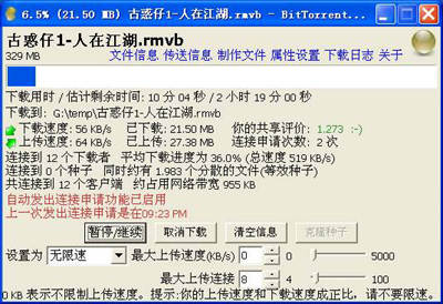 无论何种BT客户端程序,默认设置都未对下载速度和上传速度进行限制,这是因为BT软件会给上传速度较快的用户优先提供服务,也就是说上传速度越快,下载速度也越快,因此如果你使用的是宽带的话,下载时就不要去限制上传速度了。