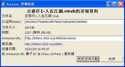 通过BT下载文件必须首先获取相应的*.torrent文件,该文件存放了Annouse URL(BT服务器地址)、文件名、大小、Place(块数,BT是将文件分成多个块来下载的)、Hash(认证代码,这是识别文件的重要依据)等信息。这些*.torrent文件可以通过登录一些常见的BT资源站点来获取。国内的BT发布站点可以查看http://btfans.3322.org页面(还有众多的其他下载资源站点,这里就不一一列举了)。