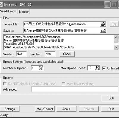 软件的使用相当简单,如图19所示,在“Torrent File”栏中导入torrent文件的URL地址或者保存路径,再设置一下文件的保存位置,然后点击窗口底部的“GO!”按钮就可以开始下载了。