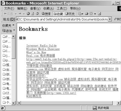 以后每次启动IE时,会直接打开收藏夹文件,我们就可以直接从网页上查找网址了(见图)。如果觉得这个网页比较单调,还可以利用网页编辑工具作进一步的修改。