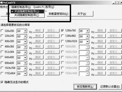 接着我们还需要在http://www.mydrivers.com/dir70/d28255.htm下载一个支持全系列雷管和最新ForceWare驱动的NvCool FX工具来打开驱动的隐藏选项。这些本来是NVIDIA为了避免普通用户误操作而故意屏蔽的功能,包括超频功能、AGP设置、和D3D垂直刷新控制等,这些选项对于驱动优化是必不可少的。NvCool FX不仅可以打开驱动的隐藏选项,它还可以锁定游戏刷新率。在选择分辨率后点击自定义按钮,更可以线性设置刷新率。不仅能保护自己的视力,也有助于提高游戏速度。
