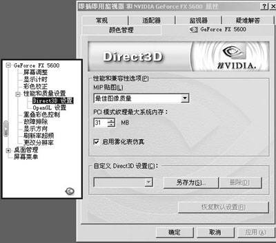 接着我们来看52.16版驱动中的DirectX 3D设置(简称D3D设置)。建议大家不论是什么级别的显卡,都不必改变这里的默认设置,都勾选上“性能和兼容性选项”中的“启用雾化表仿真”,它会提升游戏中烟雾的表现效果。“MIP贴图细节级别”是这里最值得注意的选项,在3D游戏中,根据景物距离游戏者的远近差异,显卡会自动调用不同细节大小的纹理贴图,避免不同距离使用相同大小纹理而引起的景深失真。此选项中“最佳图像质量”的纹理质量最好。