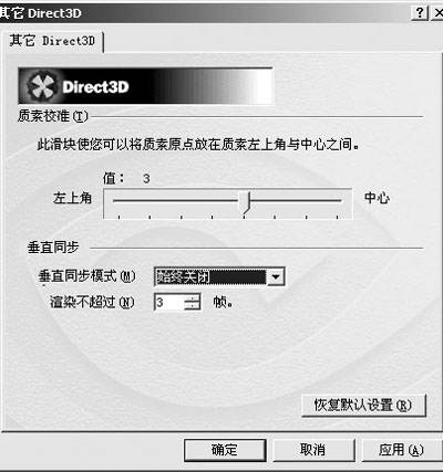 我们再点击“其他D3D”,这里有一个更奇妙的世界。第一项是“垂直刷新同步模式”,当设为始终打开时画面将和刷新率同步,如果你的屏幕刷新率是60Hz的话,游戏画面速度将受60帧/秒限制。所以在所有媒体的显卡测试中这一项是必须关闭的。对于普通用户一般情况下我们也推荐设为始终关闭。但事情并不是绝对的,比如近来备受瞩目的《实况足球PC版》,就出现了游戏中速度时快时慢的问题,如果我们将显示器屏幕刷新率设为85Hz,再将“垂直同步刷新”设为允许,就可以缓解甚至完全解决这个问题。垂直刷新同步下方的“渲染不超过”项是限制当垂直刷新同步模式被关闭后,在显卡处理游戏画面前,CPU可以准备的帧数目。当准备的帧数目过多时,可能会造成显示和键盘或手柄的输入控制不同步,所以建议大家保持默认的3帧不要改动。40系列驱动在“其他D3D选项”上和52.16版驱动差别不大。倒是20系列驱动多了一些东西,有一个质素校准控制,它可以提高对一些老游戏的画面兼容性。由于这个的默认设置已经最大可能地去兼容知名的老游戏,所以我们不用再加以改变了。