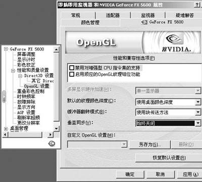 下方的纹理颜色深度决定了游戏中渲染使用的色深,如16位、32位。它在部分最新游戏中对画质有很大的影响。我们建议DX7级别显卡(GeForce 256/GeForce2 GTS系列)和MX级显卡(GeForce2 MX/GeForce4 MX系列)用户没有特殊需要的话请使用16位色深,可以提高一些游戏速度。Ti系列(GeForce3 Ti/GeForce4 Ti系列)以上的用户就可以全部使用32位色深了。接下来的缓冲器翻转模式建议选用“自动选择”,虽然使用“块传送模式”理论上可以提高一些游戏速度,但我们实测发现提升实在有限,而且更可能会带来兼容性问题,所以没有选择价值。最后的垂直同步也和D3D选项中的一样,建议始终关闭。