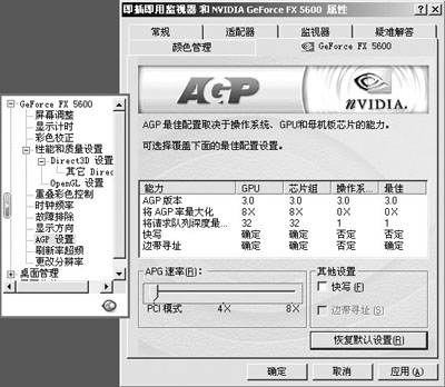 40和20系列驱动的“AGP设置”界面和52.16版驱动就不大相同了。但主要内容并没有多大差异,配置方法也是一样的,只是多了一个“请求队列深度”,这个最好不要动,自动选择就好。所以在52.16版驱动上干脆就把这个值固定下来。