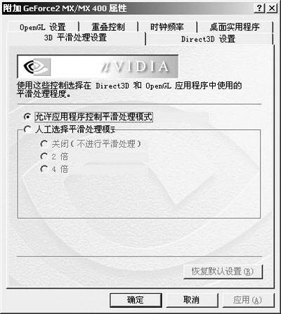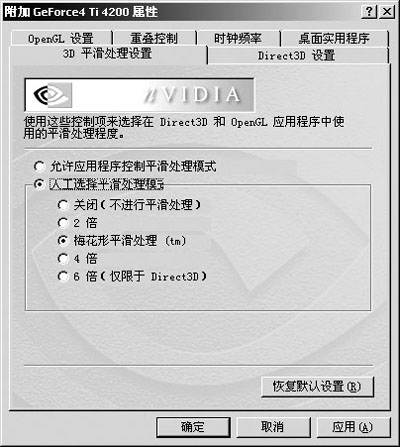 中间的“3D平滑处理设置”就是全屏抗锯齿功能设置。我们举个最基本超级采样为例说明它的工作原理:如打开4倍抗锯齿功能(4×),这个时候4倍的超采样是以4倍于实际的分辨率的情况下运算得来的,画面在你看不到的情况下被扩大了4倍,在屏幕上你看到的每一个像素,实际上是放置在后置缓冲区经4倍分辨率的渲染后的1/4。经过这种处理,能达到次像素水平的精确度,过滤这4个像素就产生了全屏幕抗锯齿的一个像素。这样运算出来的画面很漂亮,游戏中物体边缘等地方常见的锯齿都消失不见了。