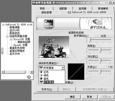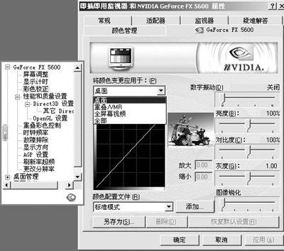 如果用来进行全屏视频播放,我们建议将数字振动拉到最高级或次高级,不要担心在这级别上太过耀眼无法进行日常的文字处理,我们下面有解决的办法。此外还可以按照不同的色彩通道对亮度、对比度、灰度进行调整,这对于作图、校正老显示器有极为现实的意义。下方还有一个新增选项“图像锐化”可以通过放大高频内容提高图形和文字的锐度,但实际使用中我们觉得,目前大家还没有打开它的必要。“彩色校正”中最大的改变是增加了“将颜色变更应用于”,它能定义“彩色校正”中所有的选项设定适用于哪些环境,包括桌面、重叠/VBR、全屏视频等。也就是说可以自定义特定的环境使用特定的设置。完全可以为阅览、作图、看视频等用途分别定制不同的色彩配置,极其方便强大。比如我们可以将数字振动设为最高,再定义为全屏幕视频下使用。这样既可保证看DVD之类全屏视频有亮丽的色彩,又不用忍受数字振动开到最高时,桌面那刺眼的光线,或者说减少看一次全屏视频便要调节一次数字振动的麻烦。相比之下,40系列驱动就没有这么方便了,少了“将颜色变更应用于”的功能使它与52.16驱动相比逊色了不少。20系列驱动的设置和40系列相同,只是界面有些变化。