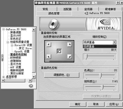 因为视频画面是叠加在原始画面上的,所以调节显卡视频播放的功能就被称为“重叠彩色控制”。这里我们不但可以更改视频的色调和饱和度,更可以根据需要设定放大视频某部分的画面。比如我们想看清一部电影右下角的细节,便可以先在“缩放屏幕区域”中点击右下角箭头,接着拖动“缩放控制”的拉杆,选择放大级别。这时再打开视频,就会发现右下角画面充满了整个屏幕,只要原始分辨率高,连电影特技中是否使用了替身演员都看得出来。40系列驱动和52.16驱动相比没什么大的差别,仅少了一个使用“调整颜色”按钮连接到“彩色较正”选项的功能。