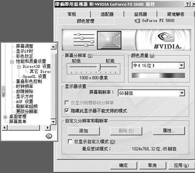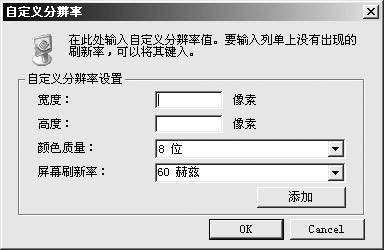 “更改分辨率”是52.16驱动新增的一个选项,它的意义不仅在于将分辨率、色深、刷新率设置这些常用功能集中在一个选项卡中,更重要的是它提供了“自定义分辨率和刷新率选项”。这对满足各种特殊要求,最大化发掘显示器的潜力十分有用。点击添加按钮,会出现对话框,让你添如所要使用的分辨率、使用色深和屏幕刷新率。点OK后会自动进行尝试,如果成功,这个分辨率设置就会出现在“屏幕分辨率选项中”。如下图中可任意设置分辨率。
