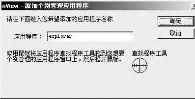 第三,“应用程序”可以自定义某个应用程序或游戏在nView中的配置。先点击添加,查找到自己所希望自定义的程序的所在位置。有两种查找方式,一种是常规的浏览,一种是拖动,用鼠标将一个类似于准星的环状物拖到要自定义的应用程序上即可。添加完成自定义程序后,再点击个别设置,会弹出窗口控制、对话框控制,甚至有半透明控制以供选择。其自定义功能确实很强大。