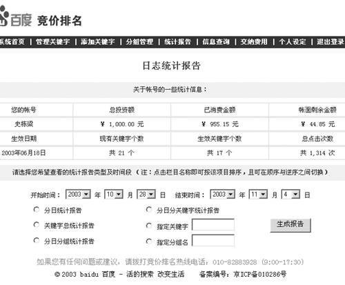11月4日,突然收到来自百度的邮件,被告知账号上的余额即将用完。我立刻登录竞价排名,发现竞价排名并没有产生这么多的费用,但总消费额上却显示消费已达到955.15元。询问百度公司后,才得知是6月20号发布的信息快递产生的费用。与百度交涉多次,他们一直认定是我的责任──在发现没有入口时没有向百度询问入口地址。
