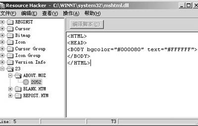 如果想改变成别的颜色,那就需要用一个名叫“Resource Hacker”的软件,其下载地址为http://www.skycn.com/soft/2147.html。下载安装后,用“ResHacker”软件打开Win 9X系统中C:/Windows/System目录里的mshtml.dll文件(在Win 2000/XP中的目录是C:/Winnt/system32),双击左窗口中标号为23的资源选项,你会看见下面有3个子选项。双击“ABOUT.MOZ”子选项,选中下标号为2052的资源。你会看到右窗口中的文字(如图所示)。找到“