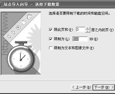 勾选“限此页和XX层之内的页”复选项,并输入需要导入层次的数目。这个参数限制FrontPage自动下载的范围,建议大家把搜索的层数限制在3层以内,因为网页的连接通常都比较多,如果下载的层数太多,就会造成过多的无效下载,反而浪费了带宽和资源。当然,如果不计较通信费用,可以试试多搜索几层。设置后勾选下面的“限此为XXKB”复选项,并输入导入文件需占用的硬盘空间。这个参数我们可以根据自己的需要进行设置,单位是KB。如果你只想导入文本和图像文件,而不包含任何组件、Java小程序和其他相关文件,则勾选“限制于文本和图像文件”复选框即可。