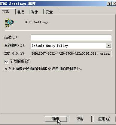 ③在弹出的“NTDS Settings”属性中,选择“查询策略”为“Default Query Policy”,并选中“全局编录”(图1)。然后单击“确定”按钮返回,并关闭此程序。