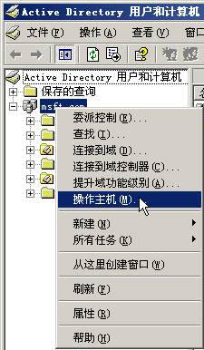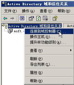 ④运行“Active Directory用户和计算机”,用鼠标右键单击“MSFT.COM”,选择“连接到域控制器”,从弹出的菜单中选择“W2003ser-2.msft.com”。