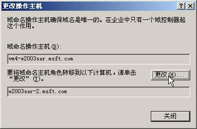 用鼠标右键单击“Active Directory域和信任关系”,从弹出的菜单中选择“操作主机”,弹出“更改操作主机”对话框(图5)。