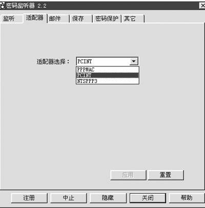 网络适配器是一个局域网内传输数据的硬件,也就是我们常说的网卡,“密码监听器”就是从网络适配器中截取密码的,所以必须在“适配器选择”下拉表中选择适合你所在的局域网的网络适配器(图1),才能使密码监听在最大程度上发挥作用。