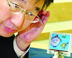 是不是觉得很奇怪:图中这位老兄不用眼睛去看,而是用耳朵去听LCD显示器。这可不是普通的LCD显示器,它是夏普公司最新推出的一个只有4英寸大小的液晶显示器,它最神奇的地方就是玻璃表面能够发出声音。夏普公司准备在2005年把这个技术产品商业化,用于移动设备,到时候它们就不再需要装上扬声器了。