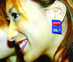 如果有人告诉你有小如耳环的存储卡,你会相信吗?如今日本存储厂商SanDisk就做到了这一点,在东京展出它的高容量存储卡。图中这款戴在模特耳朵上的存储卡“耳环”,容量达到了128MB。