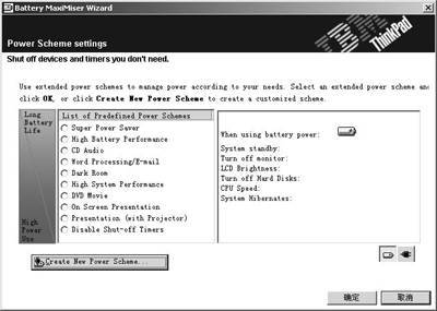 这是一款电池优化及电源管理工具,它可以让用户选择或创建电源使用方案,还有查看电池相关信息等功能。安装之后,在任务栏右侧会出现一个绿色的电池图标,在图标上单击鼠标左键会出现一个菜单,选择“View Scheme Settings”即可定制个人电源使用方案(图1),单击“Create New Power Scheme”按钮后出现设置页面,在这里可以根据自己需要设定因闲置而自动关闭硬盘、显示屏的时间、选择显示屏亮度和CPU状态等,非常个性化。