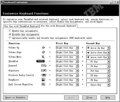 “For Use with External Keyboard”是本软件的另一项功能(图4),在这里,用户可以对音量控制、待机、休眠等进行相关的快捷键自定义。玩家完全可以根据自己喜好,设置出各具特色的快捷键。当然,万一遇到原先的快捷键被物理损坏,也可以用此法来救急。例如IBM笔记本电脑一般都用“Fn+F4”来实现待机,假如Fn键或F4键不能正常使用,可以把待机命令设为右“Ctrl+F6”,依旧可以达到待机目的。
