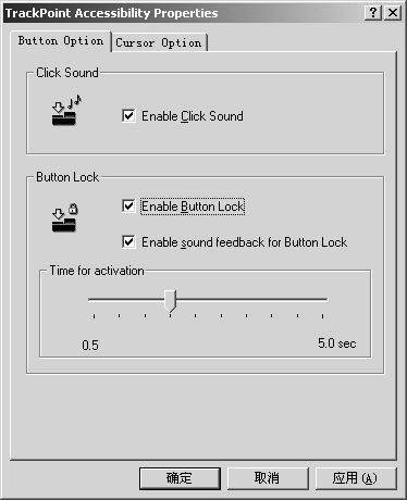 这是配合IBM TrackPoint(指点杆设备)而开发的一款辅助软件(该软件要正常使用,首先要安装3.00或3.00以上版本的IBM TrackPoint驱动程序),启动该软件后,可发现有两个选项,分别是“Button Option”(按钮选项,即指点杆设备的左右键)和“Cursor Option”(鼠标指针选项)。在“Button Option”选项中,若启用“Click Sound”,则在单击鼠标左右键时,就会发出“嘟嘟”声,可以让用户知道相关操作被确认;如果开启下方“Button Lock”中的两项功能,可以使鼠标左右键按下一定时间后即处于锁定状态(这时松开鼠标按键锁定状态仍被保持),可以方便地执行拖动操作,而下面的滑块可以让用户自由选择按下鼠标左右键到执行锁定状态之间的时间(最长为5秒)。