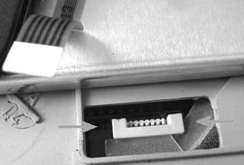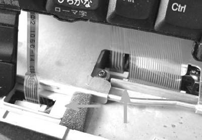 第四步,取下键盘。连着数据线怎么能取下键盘清扫呢?其实这三束数据线都是插入本本主板上的立式连接器里的,如图4所示,这时使用镊子夹住连接器的两边均匀用力往上拔,就可以松动数据线,其余两束就依此方法取下。