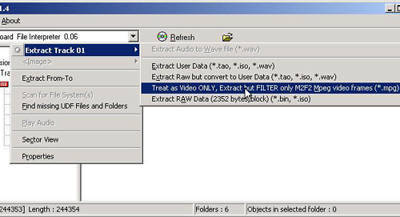 运行IsoBuster,点击“file→open image file”来打开image.img文件,在主界面中应该出现光盘的卷标和目录结构,在track 01上右击,选“extract track 01→treat as video only,extract but filter only m2f2 mpeg video frames(*.mpg)”(图5),然后选择文件存放目录,最后经过几分钟的时间就得到了原始的MPG视频文件,用来复制VCD或在PC上观看就任君选择了。