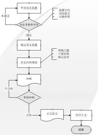 要实现用图形化的方式表达工作流程的目标,Microsoft Visio 2002就是优秀的实现工具之一。在用Visio 2002制图之前,最好先在头脑里想一想该项工作的实际要求或主要流程,然后在一张纸上把要实现的图形效果大致画出来,这样可以大大提高制作过程的效率。下面以制作一个毕业论文的写作流程图为例,该项工作的主要流程为:提出毕业论文选题→与指导教师讨论→确定选题→论文内容规划→初稿→审核初稿→正式论文→打印上交→结束。图1是制作完成后的实际效果图。下面我们来看看具体的制作方法。