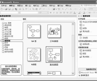 1.启动Visio 2002,进入程序主界面。在“类别”区选择流程图,然后在“模板”区单击“基本流程图”图标(图2),进入“基本流程图制作窗口”。