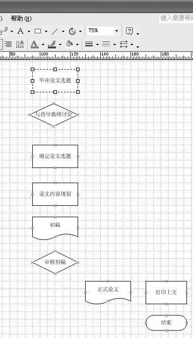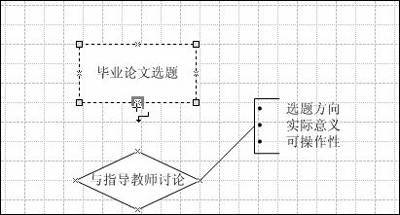 11.返回绘图区域后,将鼠标移至“毕业论文选题”图示下方的节点位置,按住鼠标左键并向下拖拉至“与指导教师讨论”图示框上节点位置,即可在两个图示框之间建立带方向的箭头连线(图6)。