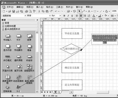 6.接下来在“基本流程图形状”区用鼠标拖拉“批注”图标至“与指导教师讨论”框右侧,以添加批注说明内容(图4)。