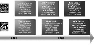 在AMD于5月14日发布的Roadmap中,AMD将于2004年发布三款新的处理器──基于Opteron、专为服务器及工作站设计的“Athens”处理器;针对桌面处理器市场的“San Diego ”处理器;针对移动处理器市场的“Odessa”处理器。而AMD最新发布的Roadmap中,则在原基础之上增加了6款处理器产品。而2005年的Roadmap部分,AMD也将扩大其产品线,增加到6款处理器产品。