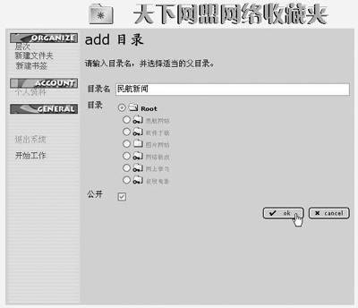 为了使收藏的网站能够分门别类方便查找,我们应该先给收藏夹建立分类文件夹。点击“新建文件夹”进入“add目录”页面(图1),在“目录名”栏中输入分类名称,并选择一个父目录,点击“ok”按钮即可。如果你想向所有用户公开你的这个收藏目录,可以勾选“公开”项。收藏夹分类建立之后,可以点击“层次”来查看整个收藏夹的分类目录情况。