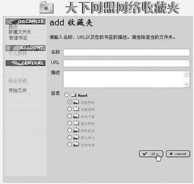 建立好收藏分类目录后,我们就可以向各个目录中添加需要收藏的网站了。点击“新建书签”进入网站添加页面(图2),输入收藏网站的名称、URL地址和网站的简单描述并在目录中选择网站的类别,然后点击“ok”按钮即可实现对该网站的收藏。