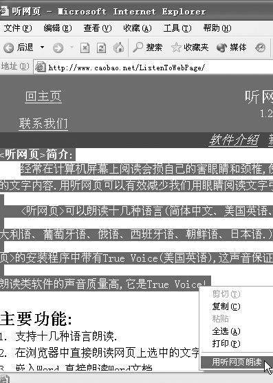 打开一个网页,然后选中需要朗读的部分,鼠标右击,选择用“听网页”朗读(见图),就能听到当前选择网页部分的内容了。怎么样?还真有点字正腔圆呢,是不是“听的比看的好”?