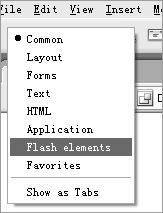 采用默认安装的DW2004只提供了一种Flash Element效果,选择工具栏快捷菜单中的Flash Element(图1)即可调出新的Flash Element工具(图2)。