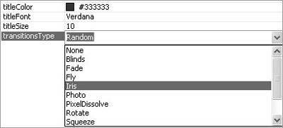 现在对各选项进行一下设置。需要注意的是imageCaptions、imageLinks以及imageURLs处的各项之间需用逗号分开,并将你的图片地址以及点击后的链接地址填入相应框内,对于色彩的设置以及其他处理大家可根据自己需要来设置,同时对于最后一项图片间的转换效果,大家可以根据自己的喜好来选择,类似制作Power Point中幻灯片间的切换效果(图4)。