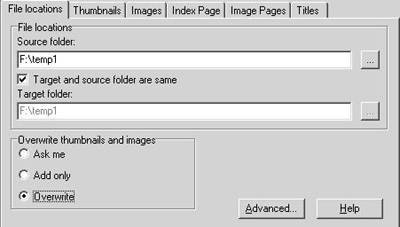 1.从http://www.skycn.com/soft/490.html处下载安装该软件后进入程序主界面,点击“File locations”标签设置原图与缩略图的路径,例如在“Source folder”中输入“temp1”,勾选“Target and source folder are same”,使原图与缩略图的路径一致(图1)。