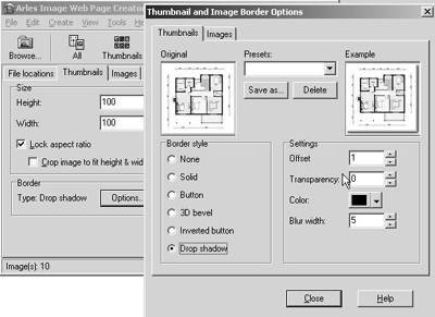 2.点击“Thumbnails”标签设置将要生成的缩略图的大小、边框效果、前后缀名等。在Size栏(图2)的Height中输入100,Width中输入100;在Border栏中点击“Options..”按钮设置缩略图边框效果,在图2右边对话框中点中“Drop shadow”给缩略图加上立体阴影,适当调整Settings参数使阴影效果更好。