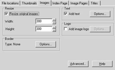 3.点击“Images”标签对源图做改变大小、加水印等处理。水印效果非常实用,不仅保护了自己的作品,而且使自己的作品更专业。可以以文字或者图形资源做水印,如选择加入文字,则勾选Text栏的“Add text”(图3), 点击“Options..”按钮设置水印效果。